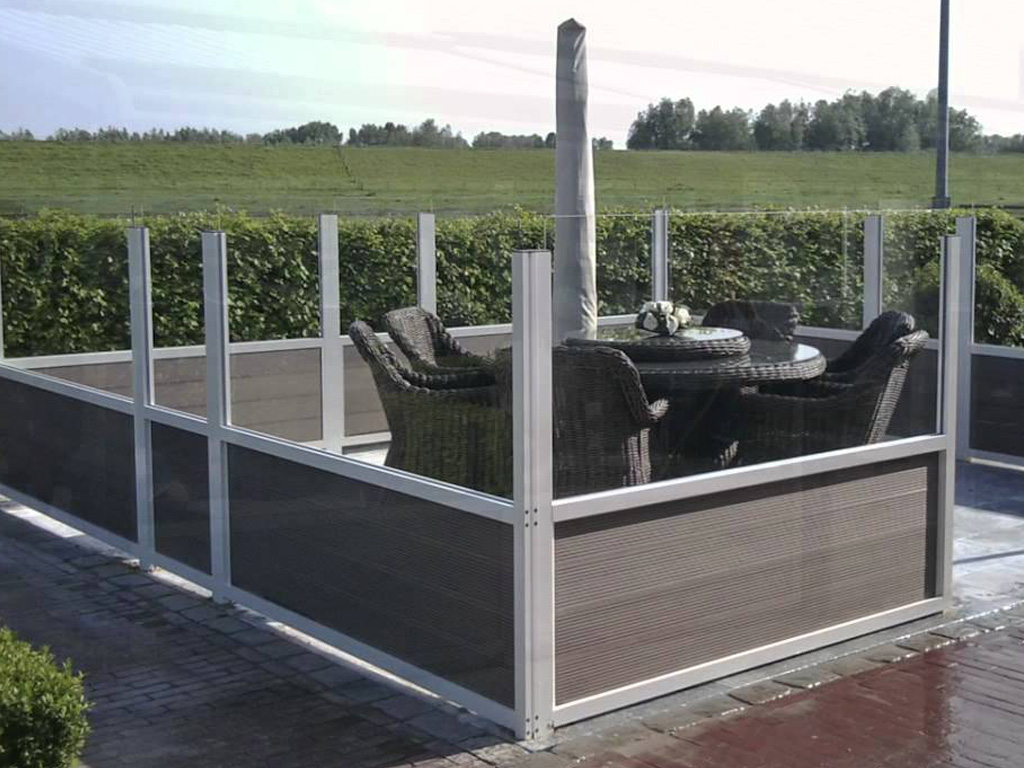 Een terrasscherm of schutting biedt privacy, bescherming tegen wind en zon, en creëert een gezellige, afgeschermde buitenruimte.